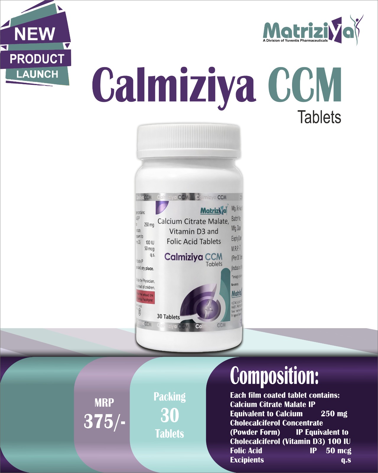 CALMIZIYA CCM | 30 Tab + HDPE | Calcium Citrate Malate 250mg + Vitamin D3 100mg+ Folic Acid 50mcg Tablets | Details |