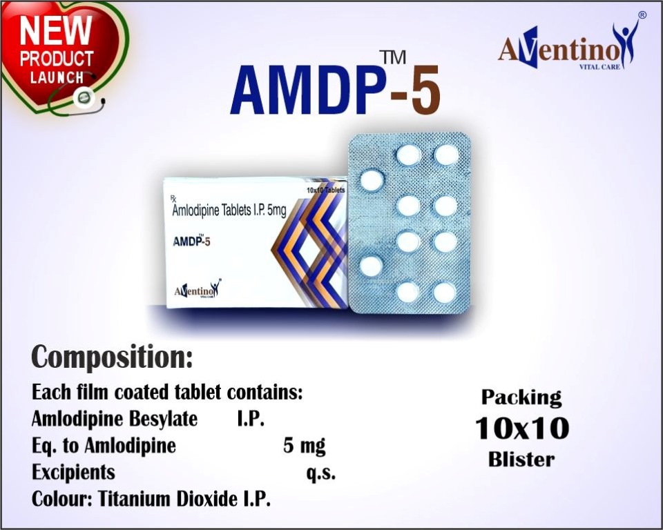AMDP™-5 Amlodipine Tablets I.P. 5mg | 10x10 Blister | Each film-coated tablet contains: Amlodipine Besylate I.P. Equivalent to Amlodipine 5 mg Excipients: q.s. Colour: Titanium Dioxide I.P. | Details |