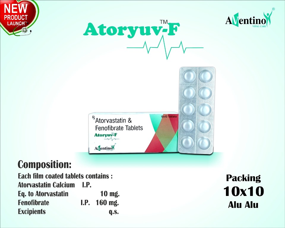 Atoryuv-F™ - Atorvastatin & Fenofibrate Tablets | 10x15 ALU ALU | Atorvastatin Calcium I.P. equivalent to Atorvastatin 10 mg Fenofibrate I.P. 160 mg Excipients: q.s. | Details |