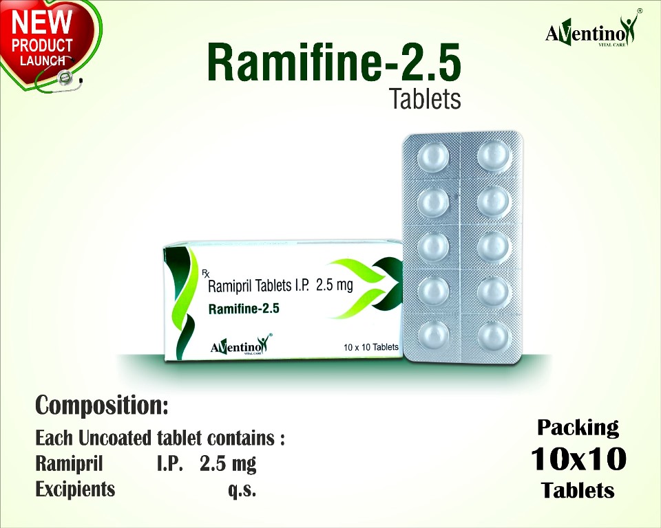 Ramifine-2.5 Tablets - Ramipril Tablets I.P. 2.5 mg | 10*10 | Each uncoated tablet contains: Ramipril I.P.: 2.5 mg Excipients: q.s. (quantity sufficient) | Details |