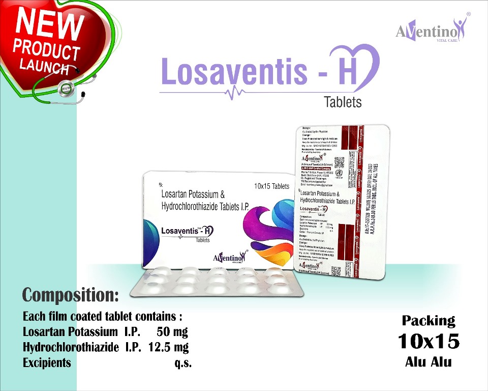 Losaventis-H Tablets - Losartan Potassium & Hydrochlorothiazide Tablets I.P. | 10*15 | Each film-coated tablet contains: Losartan Potassium I.P.: 50 mg Hydrochlorothiazide I.P.: 12.5 mg Excipients: q.s. | Details |