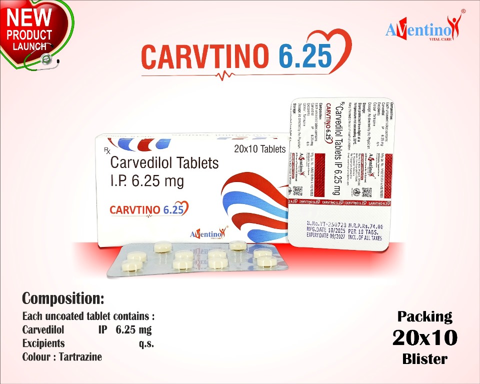 CARVTINO 6.25 - Carvedilol Tablets I.P. 6.25 mg | 20*10 | ach uncoated tablet contains: Carvedilol I.P.: 6.25 mg Excipients: q.s. Colour: Tartrazine | Details |