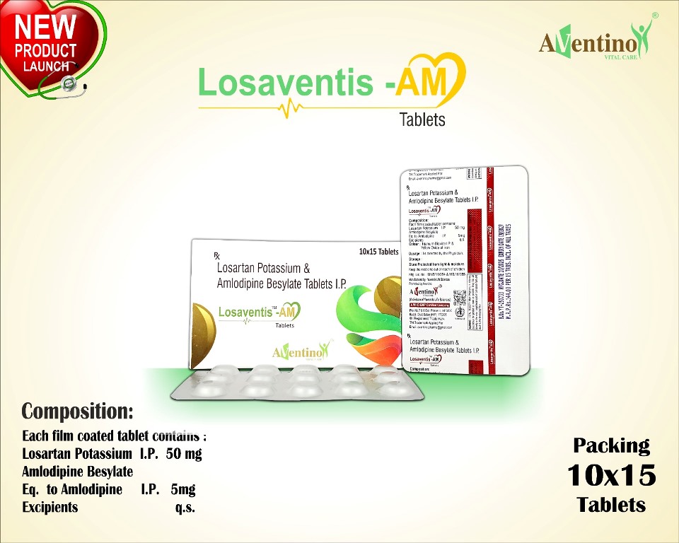 Losaventis-AM | 10*15 | Each film-coated tablet contains: Losartan Potassium I.P.: 50 mg Amlodipine Besylate: Equivalent to Amlodipine I.P. 5 mg Excipients: q.s. | Details |