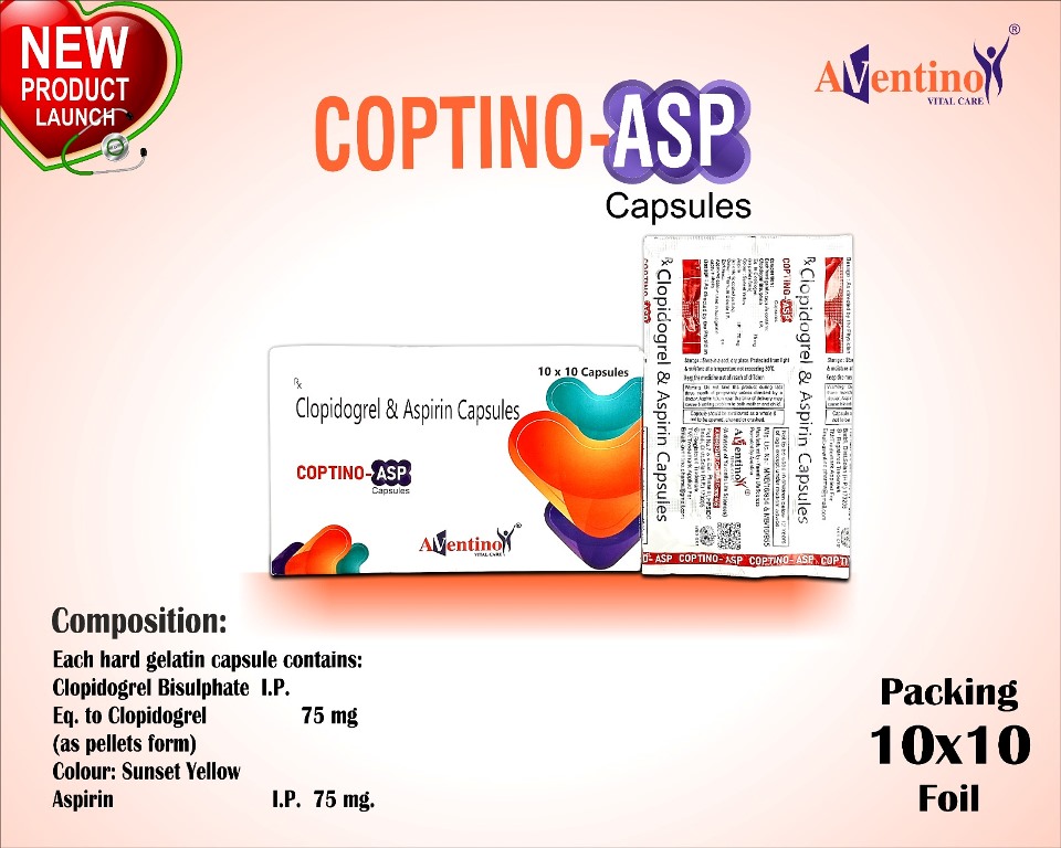COPTINO-ASP Capsules - Clopidogrel & Aspirin Capsules | 10*10 | Each hard gelatin capsule contains: Clopidogrel Bisulphate I.P.: Equivalent to Clopidogrel 75 mg (as pellets form) Aspirin I.P.: 75 mg Colour: Sunset Yellow | Details |