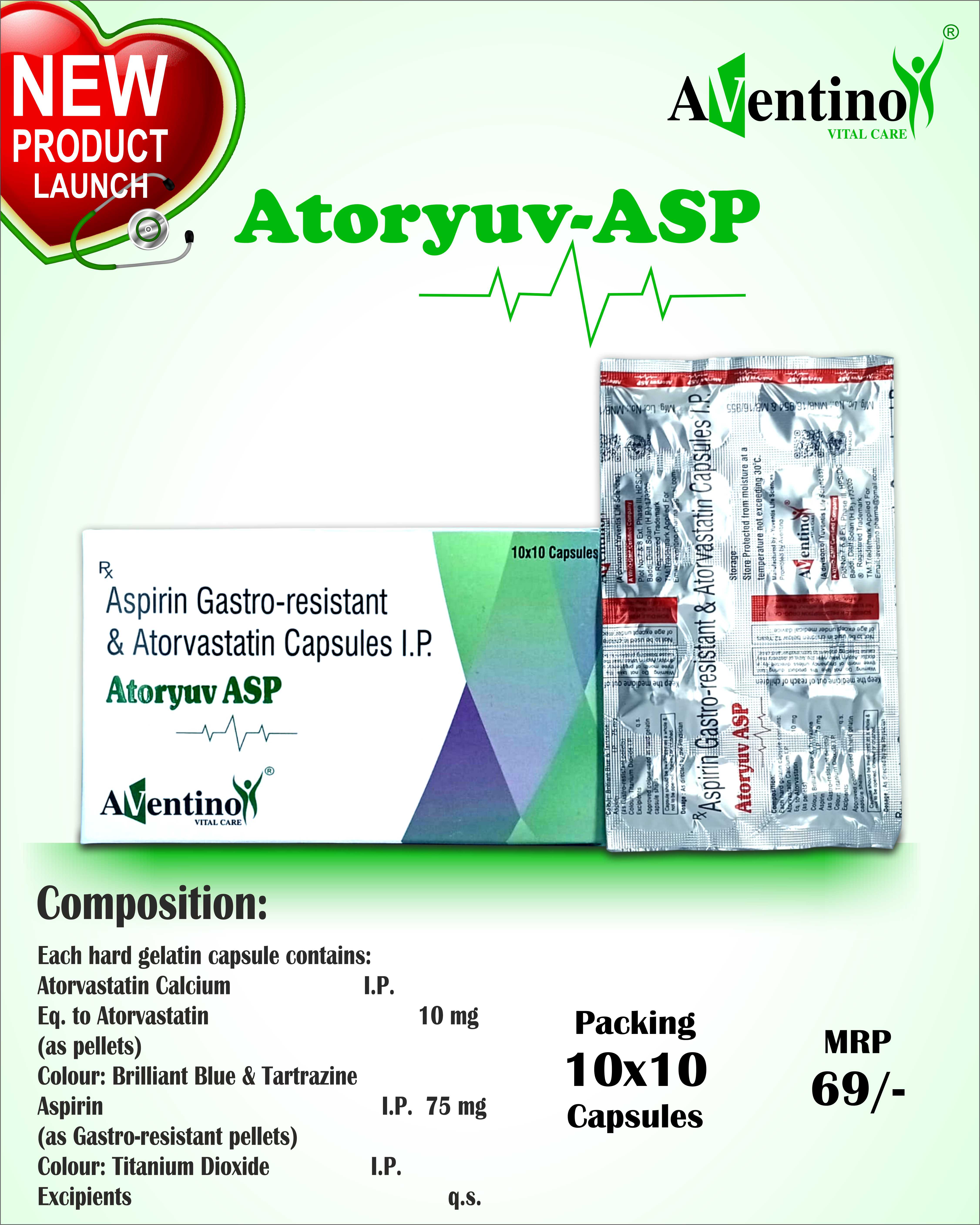 Atoryuv ASP | 10*10 | Atorvastatin Calcium I.P. 10mg + Aspirin I.P. 75mg Capsules | Details |