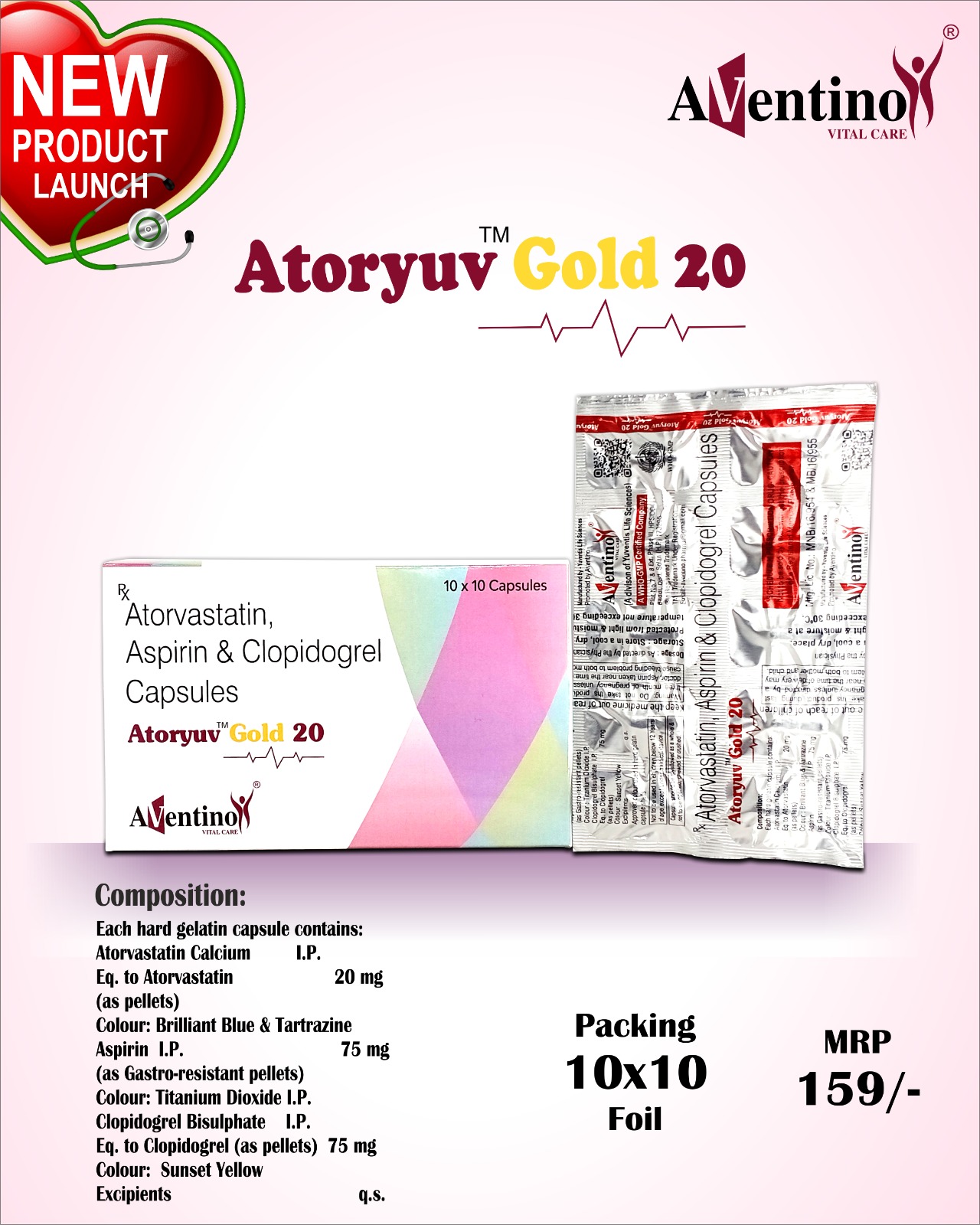 Atoryuv GOLD 20 | 10*10 | Atorvastatin Calcium I.P. 20mg + Clopidogrel I.P. 75mg + Aspirin I.P. 75mg Capsules | Details |