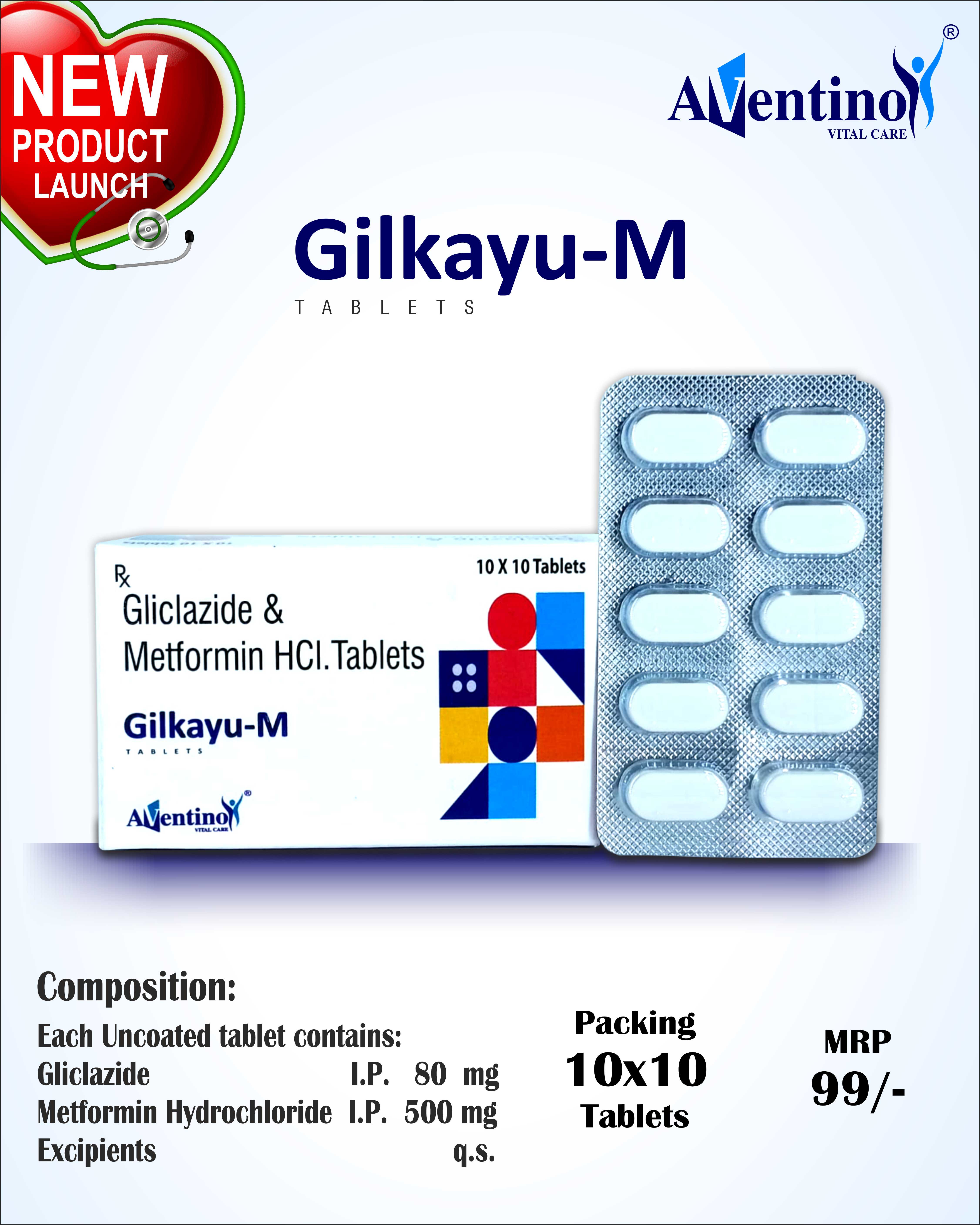 Gilkayu m | 10*10 | Gliclazide 80mg + Metformin Hydrochloride I.P. 500mg Tablet | Details |