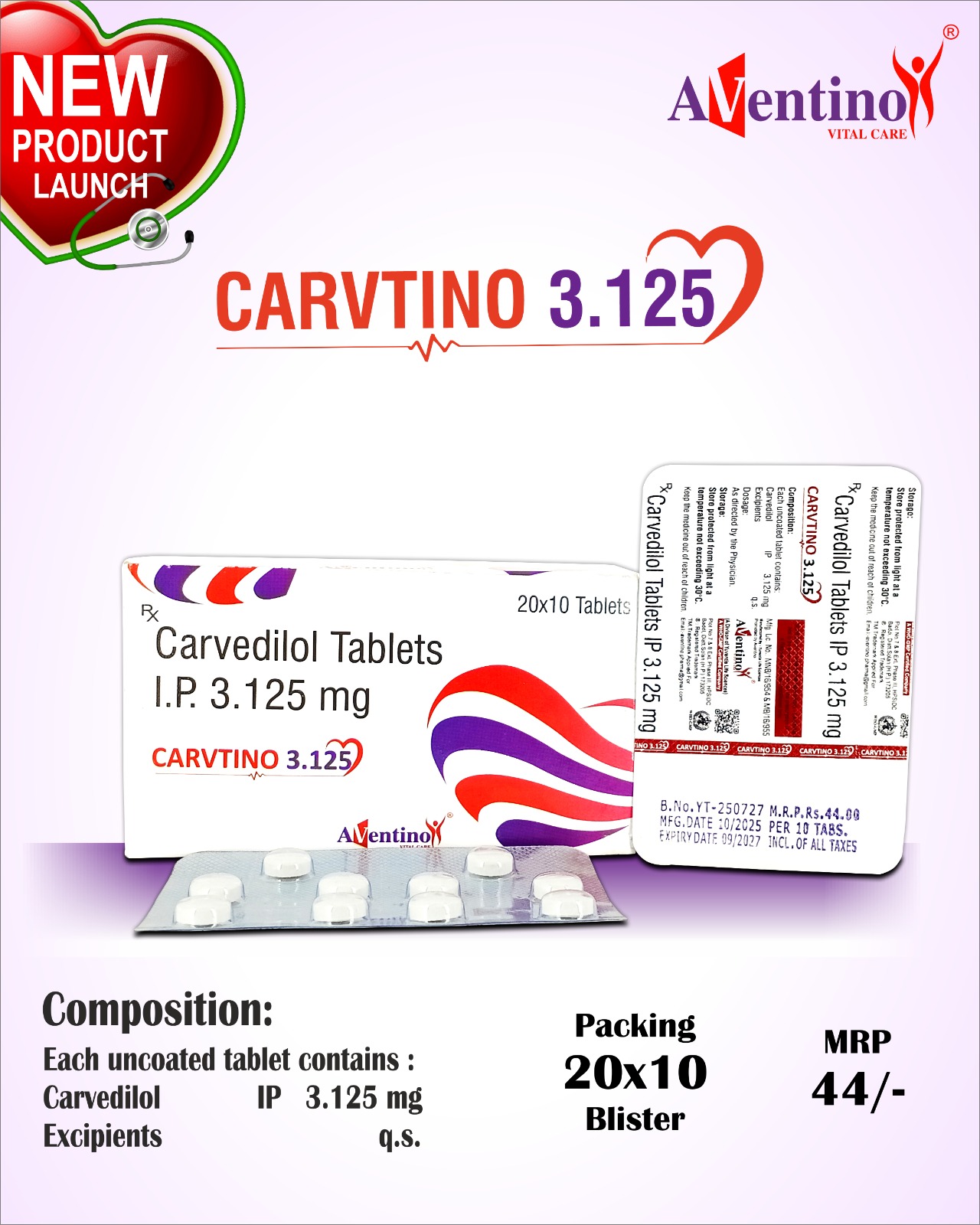 CARVTINO 3.125 | 10*10 | Carvedilol I.P. 3.125mg Tablets | Details |