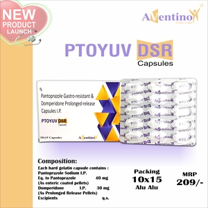 PTOYUV DSR | 10*10 | Pantoprazole Sodium I.P. 40mg + Domperidone I.P. 30mg Capsules | Details |