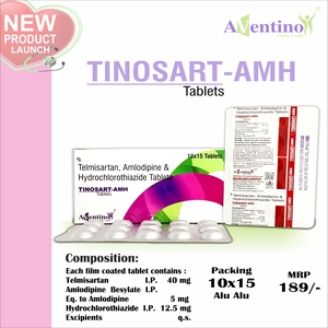 Tinosart AMH | 10*15 | Telmisartan I.P. 40mg + Amlodipine I.P. 5mg + Hydrochlorthiazide I.P. 12.5mg Tablets | Details |