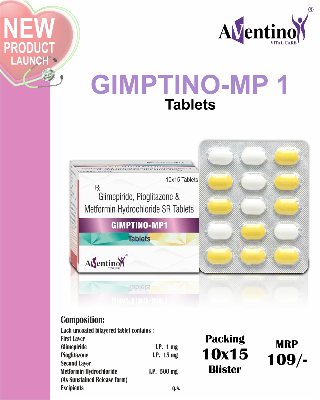 Gimptino MP1 | 10*15 | Glimepiride 1mg + Metformin 500mg + Pioglitazone 15mg Bi-Layered Tablets | Details |