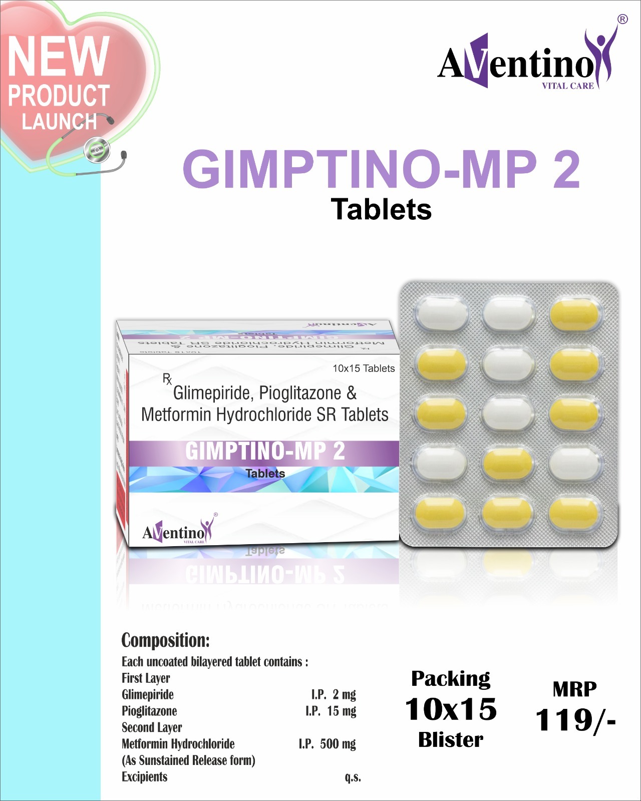 Gimptino MP2 | 10*15 | Glimepiride 2mg + Metformin Hydrochloride I.P. 500mg + Pioglitazone 15mg Bi-Layered Tablets | Details |