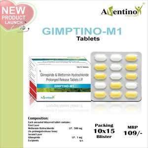 Gimptino M1 | 10*15 | Glimepiride (1mg) + Metformin (500mg) SR Bilayered Smart Tablet | Details |