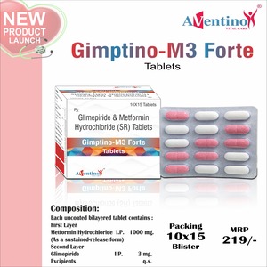 Gimptino M3 Forte | 10*10 | Glimepiride (3mg) + Metformin (1000mg) SR Bilayered Smart Tablet | Details |
