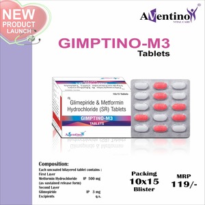 Gimptino M3 | 10*10 | Glimepiride (3mg) + Metformin (500mg) SR Bilayered Smart Tablet | Details |