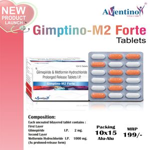 Gimptino M2 Forte | 10*15 | Glimepiride (2mg) + Metformin (1000mg) SR Bilayered Smart Tablet | Details |
