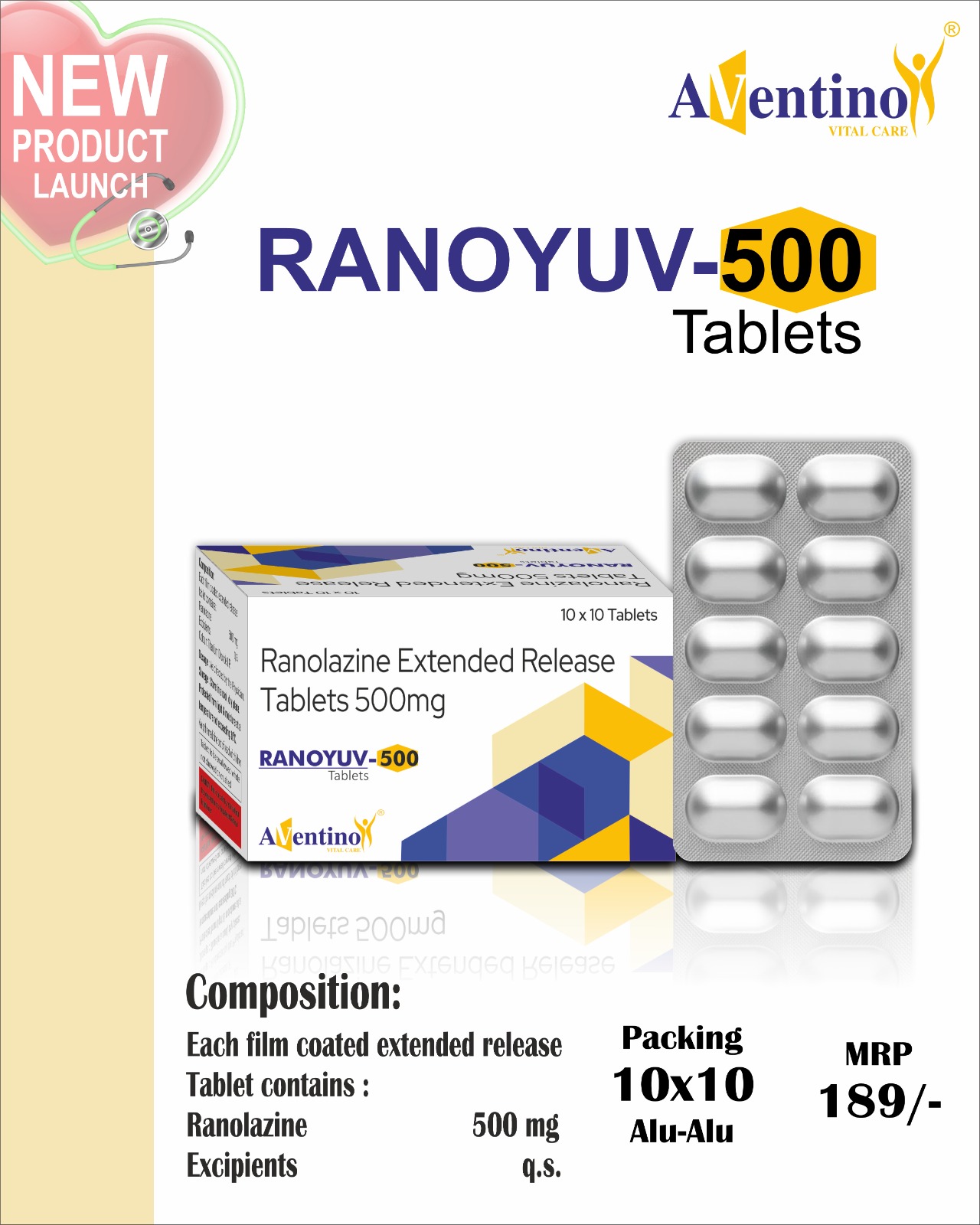 RANOYUV 50 | 10*10 | Ranolazine I.P. 500mg (E.R.) Tablets | Details |