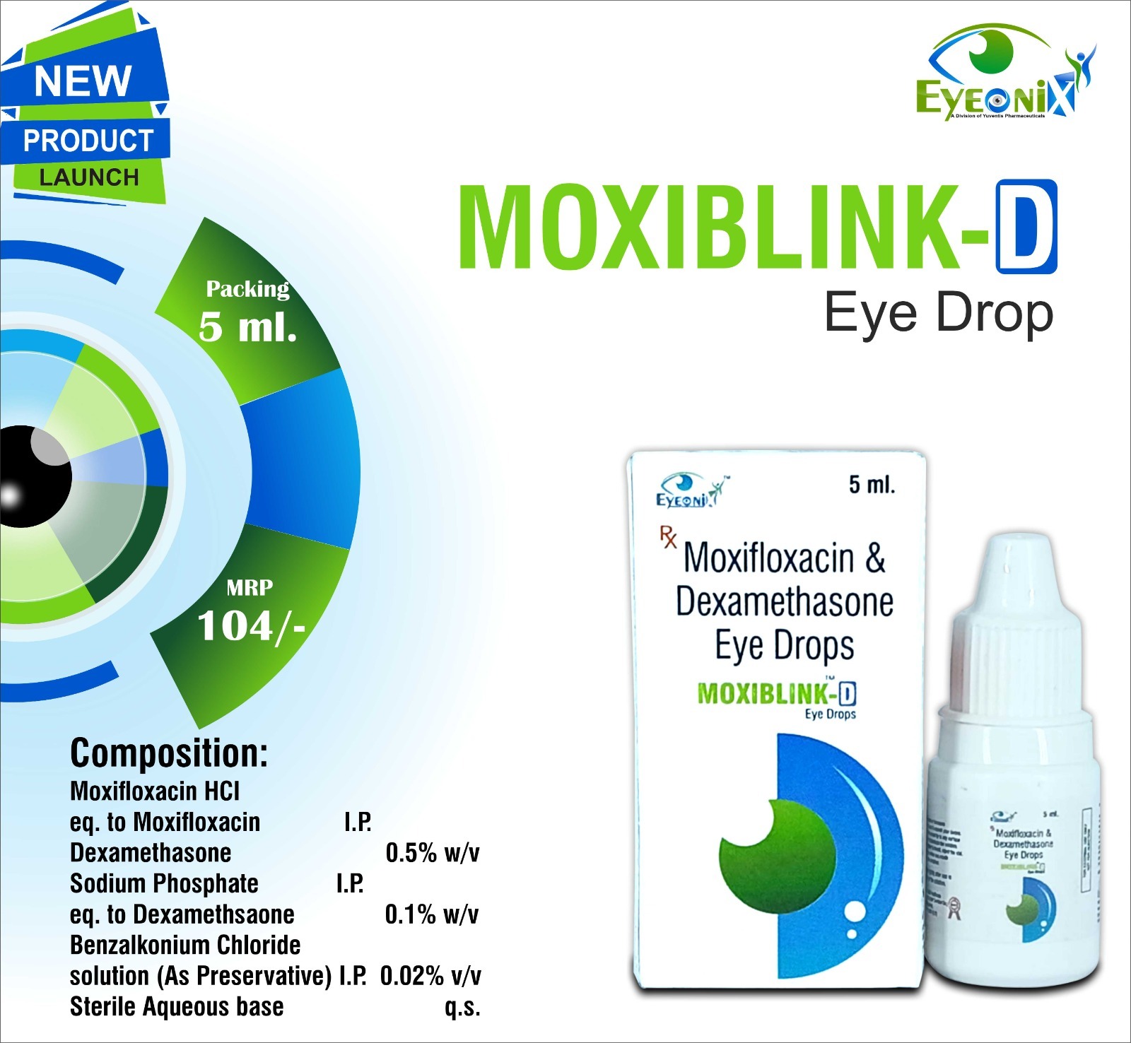 Moxiblink D ™ | Eye Drop - 5ml | Moxifloxacin HCL I.P. 0.5% w/v + Dexamethasone Sodium phosphate I.P. 0.1% w/v Eye Drop | Details |