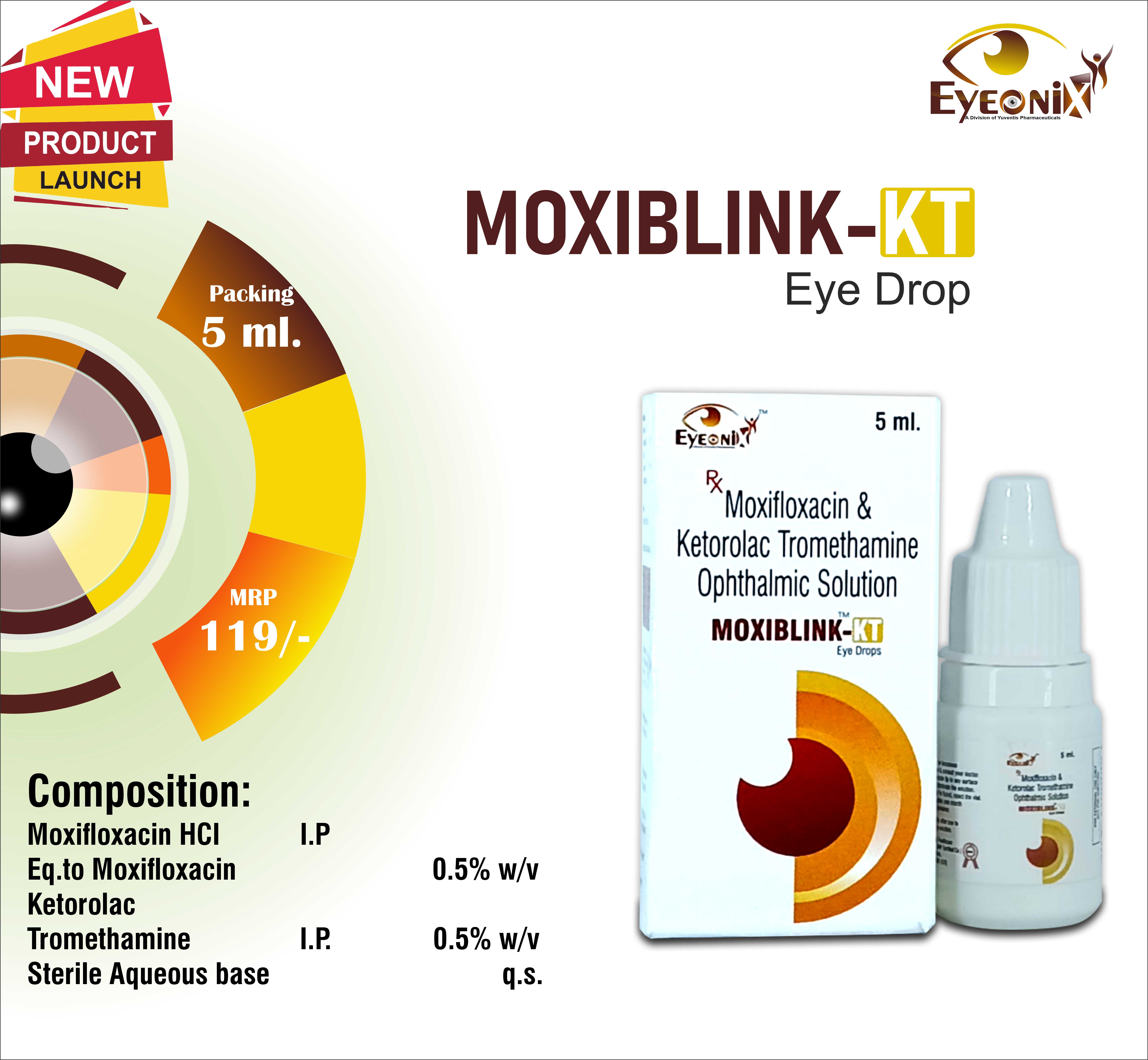 Moxiblink KT ™ | Eye Drop - 5ml | Moxifloxacin HCL I.P. 0.5% w/v + Ketorolac Tromethsmine I.P. 5% w/v Eye Drop | Details |