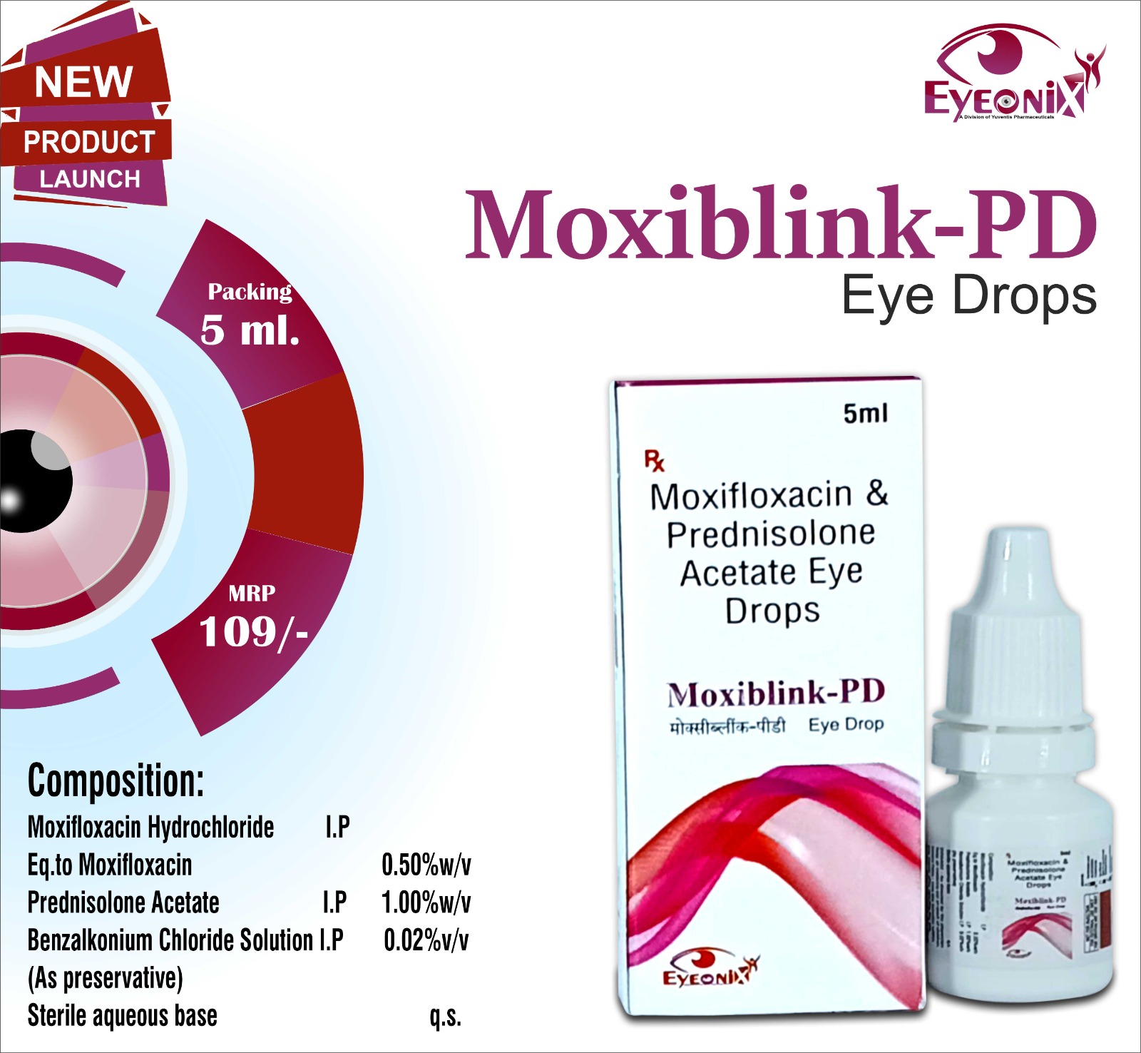 MoxiBlink PD | Eye Drop - 5ml | Moxifloxacin HCL I.P. 0.5% + Prednisolone Acetate I.P. 1% w/v Eye Drop | Details |