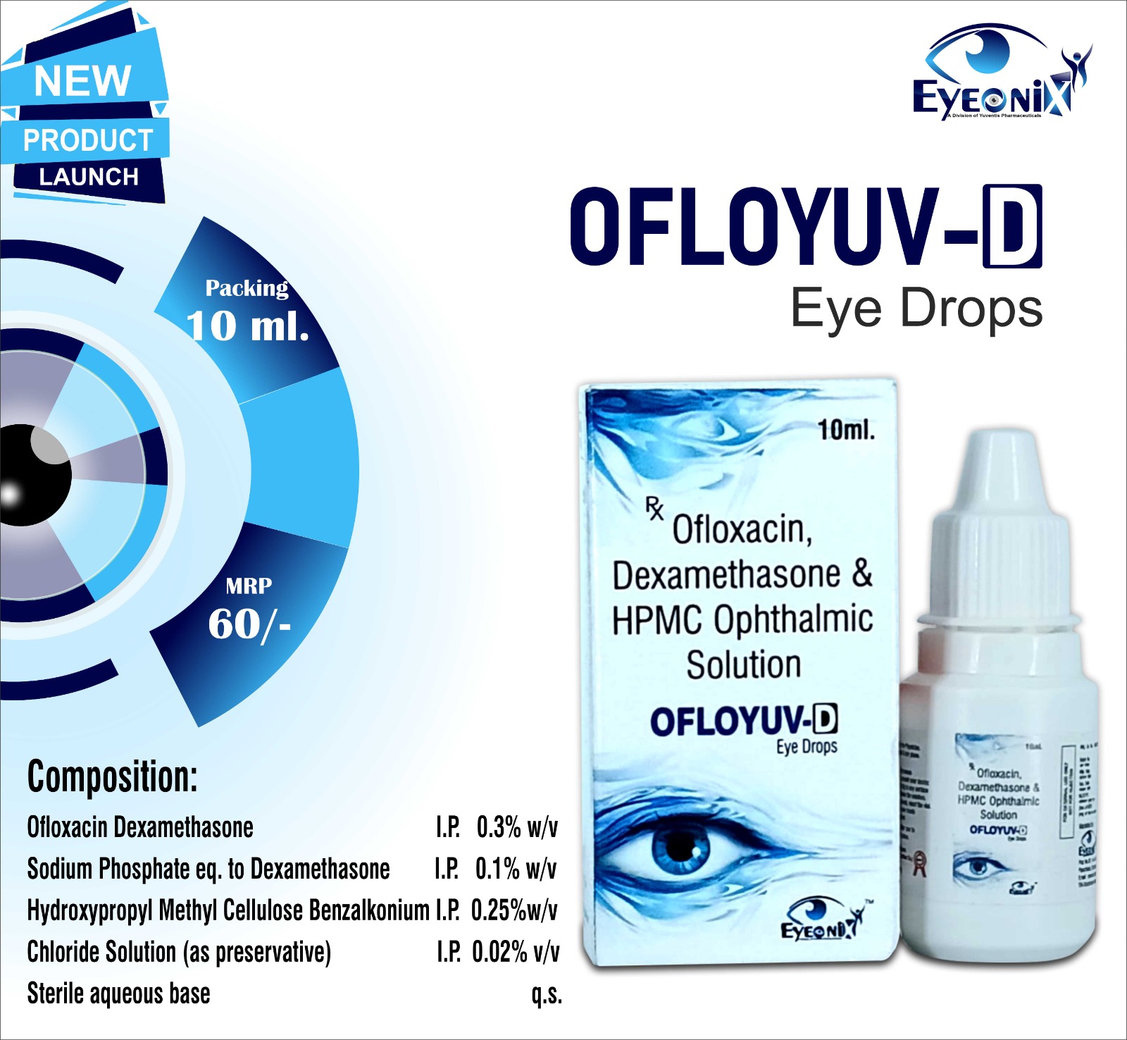 OFLOYUV D | Eye/Ear Drop 10ML | Ofloxacin I.P. 0.3% w/v + Dexamethasone Sodium Phosphate I.P. 0.1% w/v + Hydroxypropyl Methyl Cellulose I.P. 0.25% v/v Eye / Ear Drops | Details |