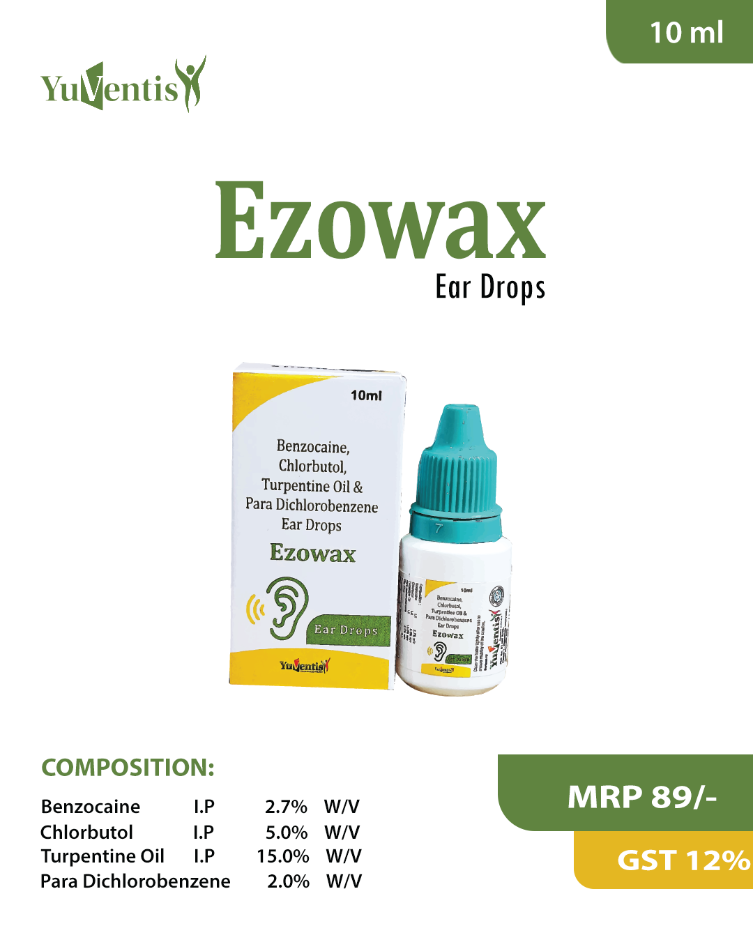 EZOWAX EAR DROP | Eye Drop- 10 ml | Benzocaine I.P. 2.7% w/v + Chlorbutol I.P. 5.0% w/v + Turpentine Oil I.P. 15.0% w/v + Paradichlorobenzene I.P. 2.0% w/v Ear Drop | Details |