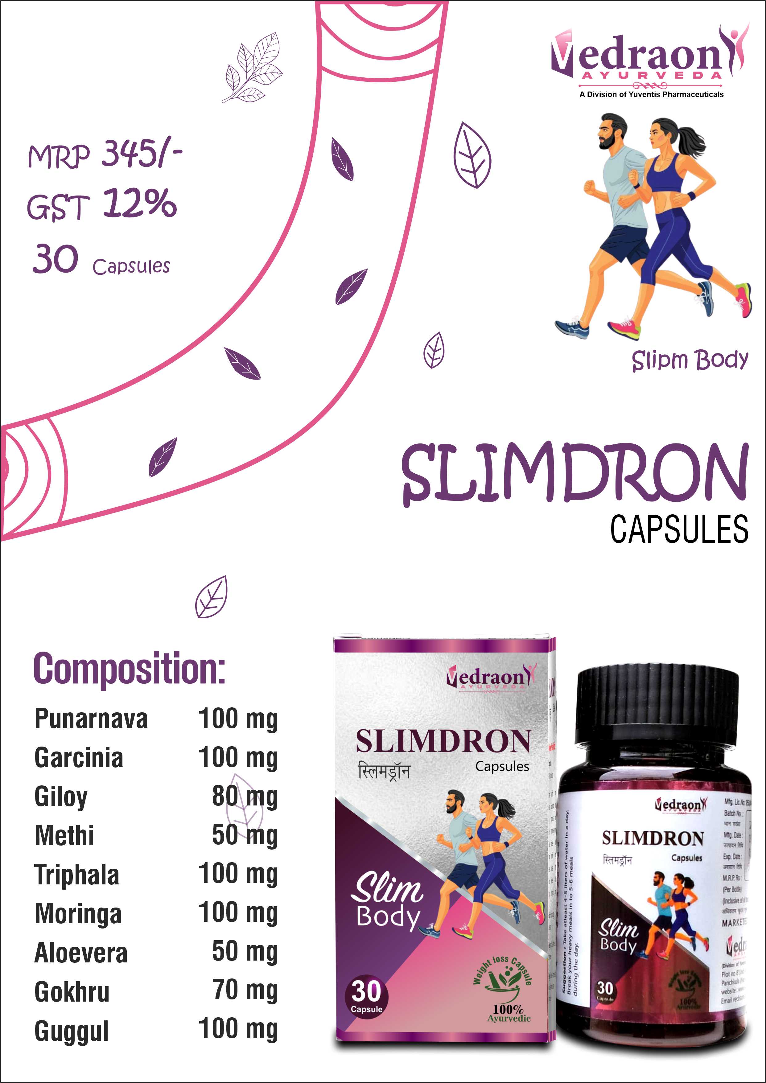 SLIMDRON CAPSULES | 30 Capsules | Punarnava 100 mg Garcinia 100 mg Giloy 80 mg Methi 50 mg Triphala 100 mg Moringa 100 mg Aloevera 50 mg Gokhru 70 mg Guggul 100 mg | Details |