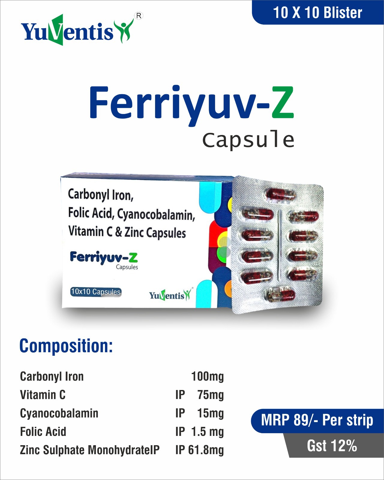 FERRIYUV-Z | 10*10 | Carbonyl Iron, Folic Acid, Cyanocobalamin, Vitamin C & Zinc Capsules | Details |