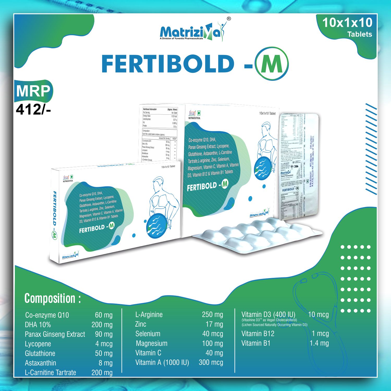 FERTIBOLD M Tab | 10*1*10 | L-arginine 250mg + L-carnitine L-tartrate 200mg + Docosahexaenoic Acid 200mg + Magnesium 100mg + Elemental Zinc 17mg + Thiamine 1.4mg + Vitamin C 40mg + Ubiquinol 30mg + Ginseng Extract 10mg + Astaxanthin 8mg + Lycopene 4mcg + LGlutathione 2.5mg + Sodium Selenate 40mcg + Cyanocobalamin 1mcg + Vitamin A 1000 IU + Vitamin D3 400 IU | Details |