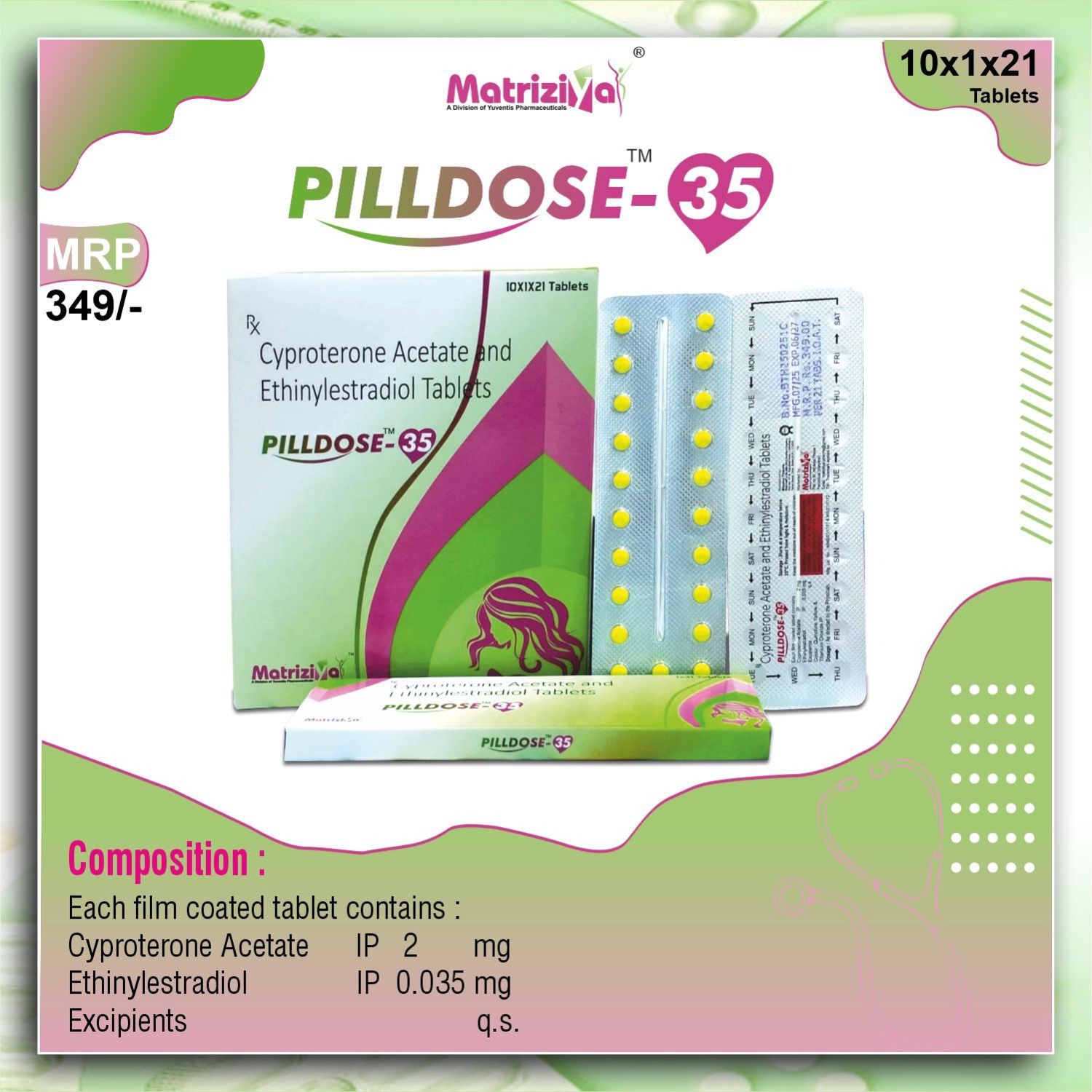 PILLDOSE 35 | 10x1x21 Blister | Cyproterone Acetate I.P. 2mg + Ethinylestradiol I.P. 0.035mg Tablets | Details |