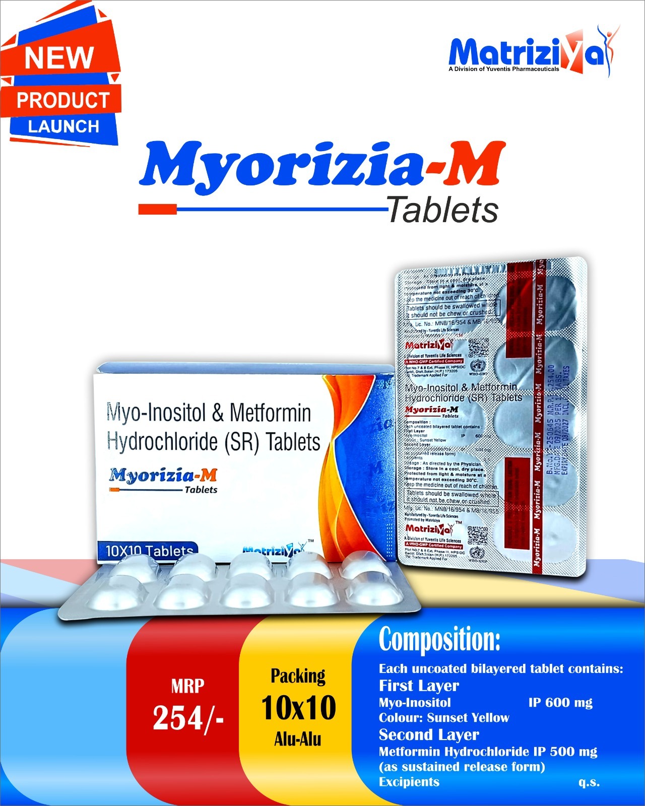 Myorizia M Tab | 10*10 | Myo-Inositol USP 600mg + Metformin HCL I.P. 500mg (SR) Tablets | Details |