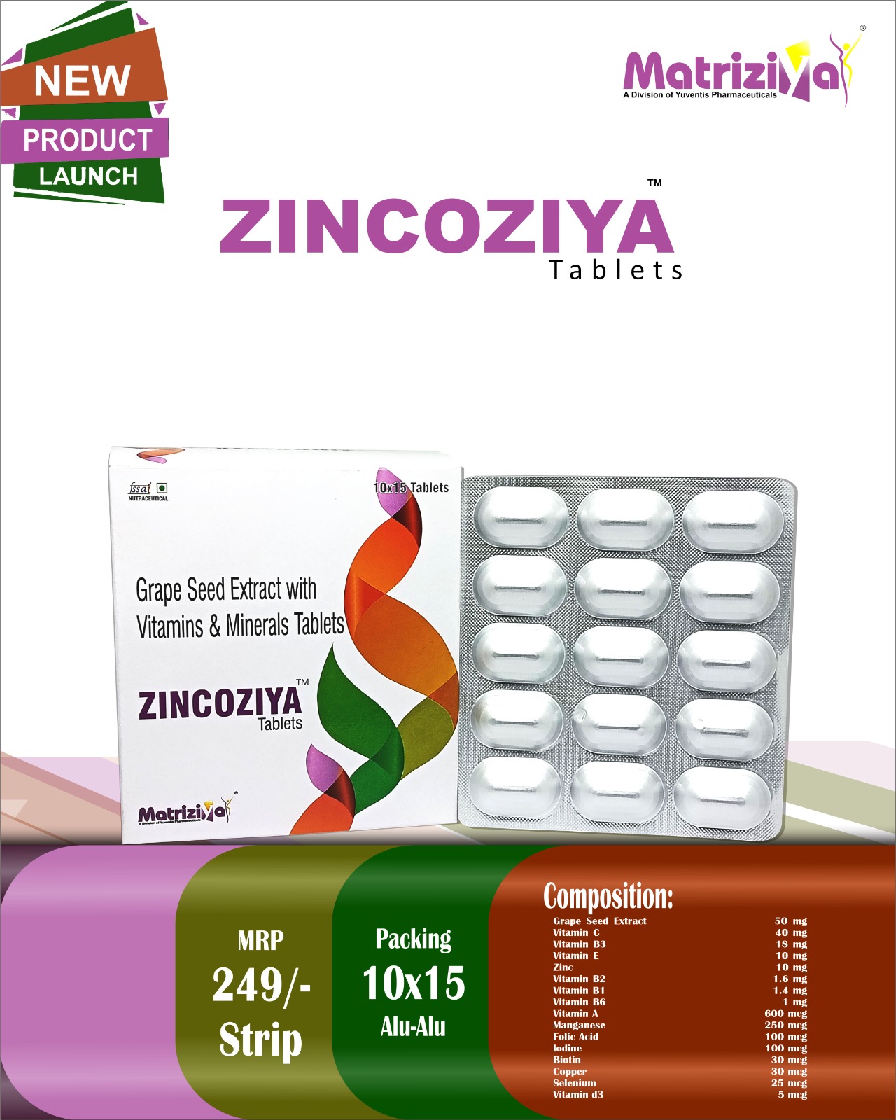 Zincoziya Tab | 10x15 ALU ALU | Grape Seed Extract 50mg + Vitamin C 40mg + Vitamin B3 18mg + Vitamin E 10mg + Zinc 10mg + Vitamin B2 1.6mg + VitaminB1 1.4mg + Vitamin B6 1mg + Vitamin A 600 μg + Manganese 250μg + Folic Acid 100μg + Iodine 100μg + Biotin 30μg + Copper 30μg + Selenium 25μg + Vitamin D3 5μg + Vitamin B12 1 Tablets | Details |