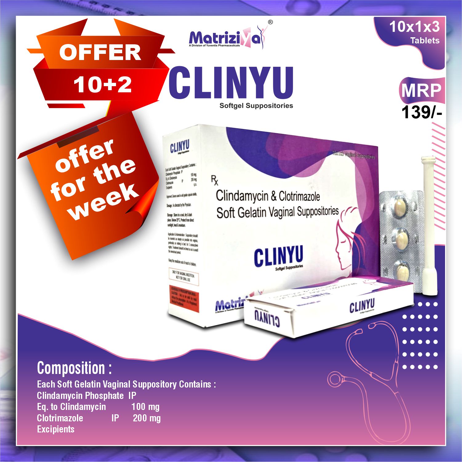 CLINYU | 10*1*10 | Clindamycin I.P. 100mg + Clotrimazole I.P. 200mg Softgel Vaginal Suppositories | Details |