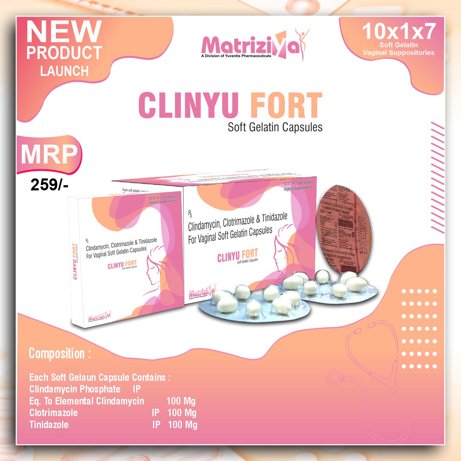 CLINYU FORT | 10x1x7 | Clindamycin I.P. 100mg + Clotrimazole I.P. 100mg + Tinidazole I.P. 100mg Softgel Capsules | Details |