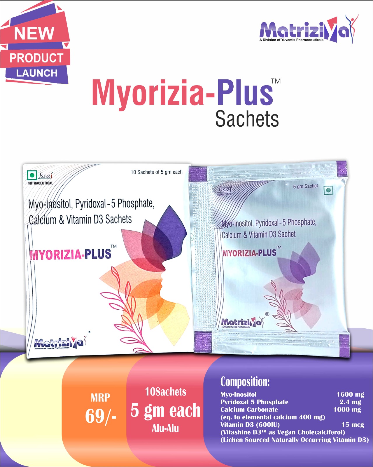 Myorizia Plus Sachet | 10*5gm | Myo Inositol 2000mg + Pyridoxal 5 Phosphate 2.4mg + Calcium 1000mg + Vitamin D3 (600IU) | Details |