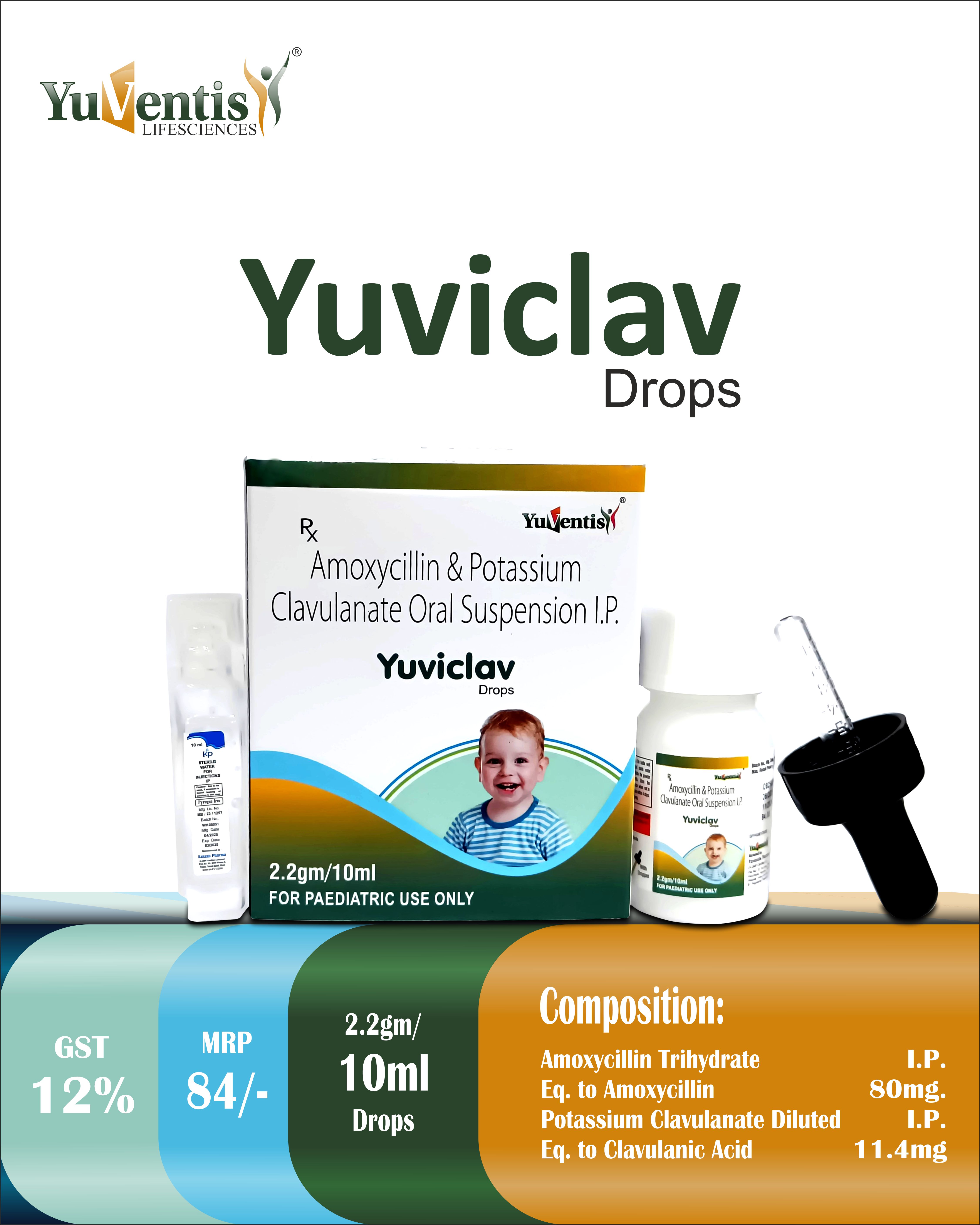 YUVICLAV DROP | 10 ml | Amoxycillin I.P. 80 mg + Calvulanate Potassium I.P. 11.4 mg DROP | Details |