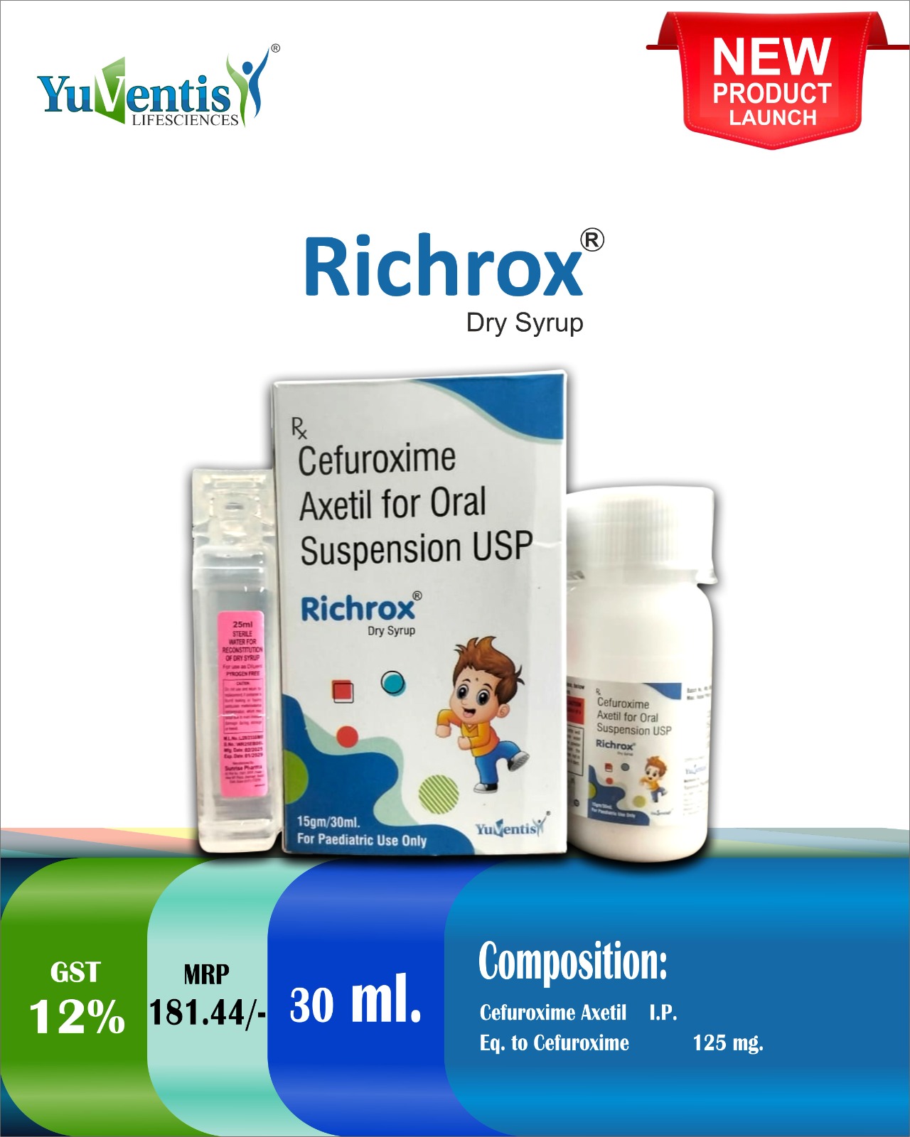 RICHROX DRY SYRUP | 30 ml | Cefuroxime Axetil I.P., Eq. to cefuroxime 125 mg | Details |
