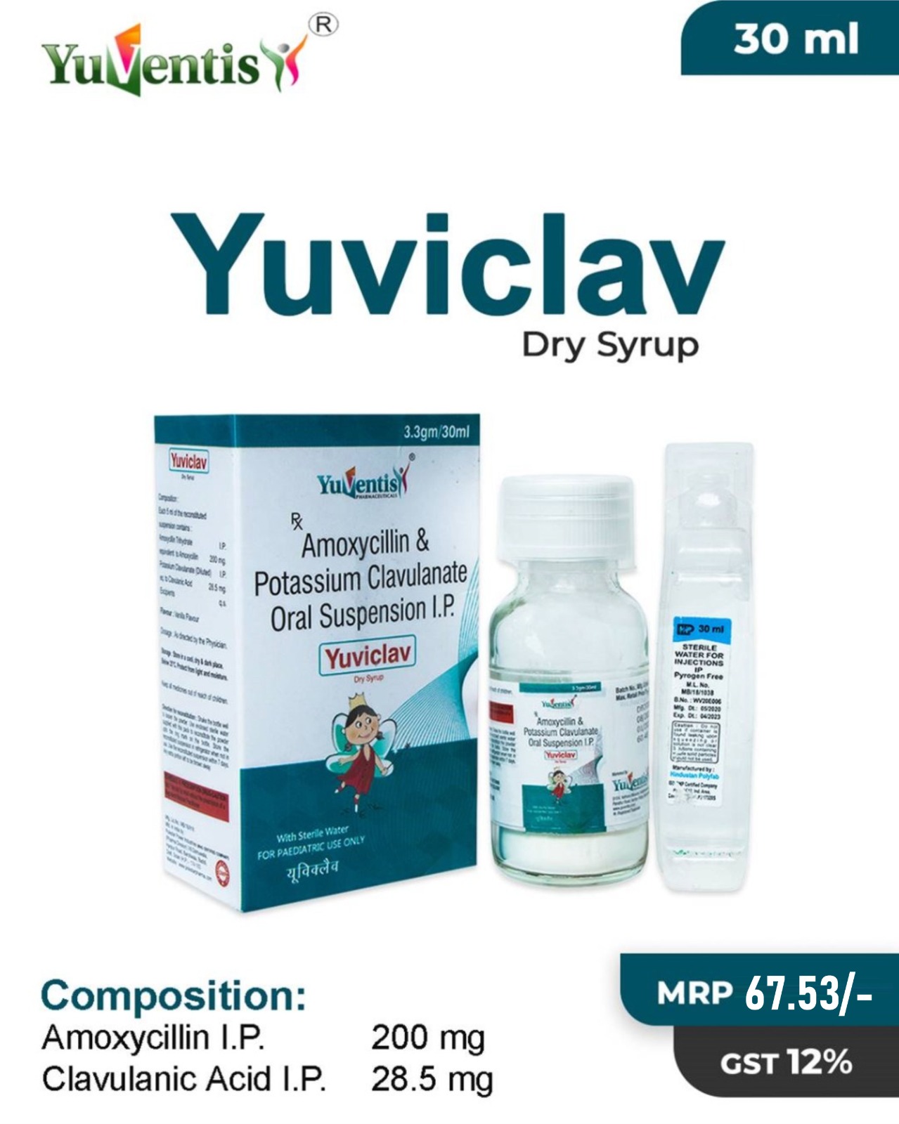 YUVICLAV- 457MG D/S GLASS BOTT. 30ml | 30 ml | Amoxycillin I.P. 400 mg + Clavulanic Acid I.P. 57 mg (Dry Syrup)With glass and W.F.I. | Details |
