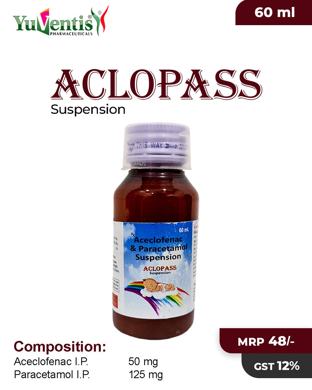 ACLOPASS SUSP (60ML) | 60 ml | Aceclofenac I.P. 100 mg + Paracetamol I.P. 325 mg (Blister) | Details |