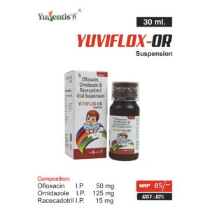 YUVIFLOX-OR SUSP. | 30 ml | Ofloxacin I.P 50mg,Ornidazole I.P.125mg, Racecadotril I.P. 15mg Oral Susp. | Details |
