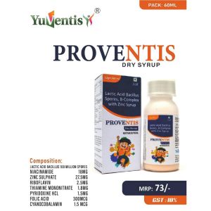 PROVENTIS DRY SYRUP | 60 ml | Lactic Acid Bacillus 100 Million Spores: Niacinamide 18MG, Zinc Sulphate 27.5MG, Riboflavin 2.5MG, Thiamine Mononitrate 1.8MG, Pyridoxine HCL 1.5MG, Folic Acid 300MCG, Cyanocobalamin 1.5MCG | Details |